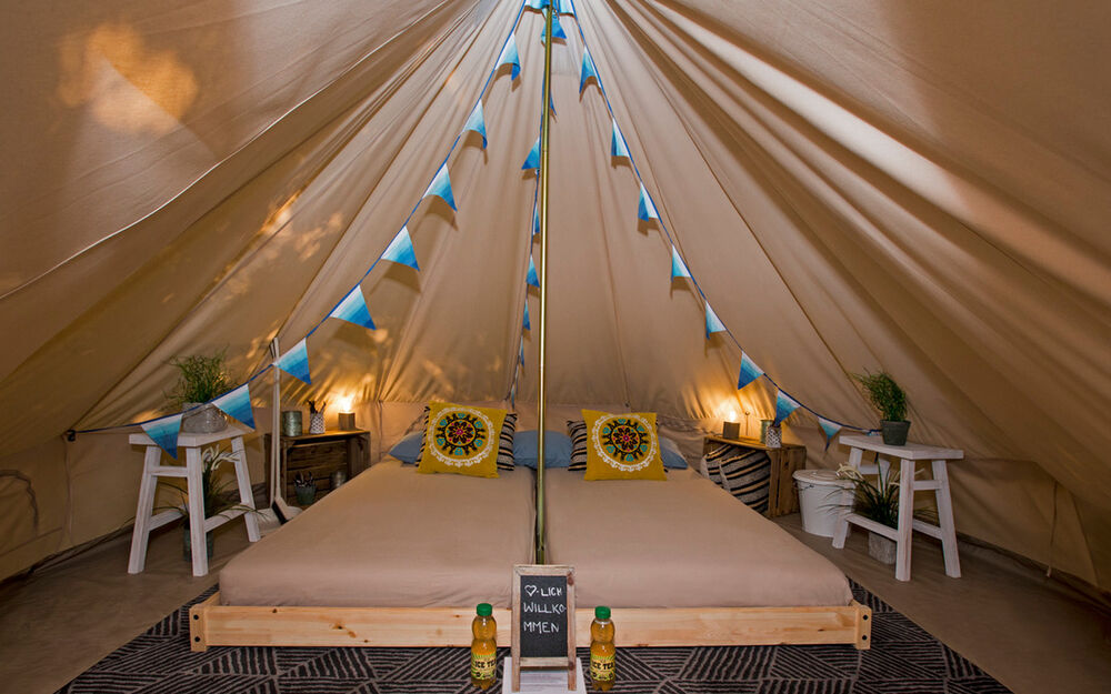Natur pur - campen ohne eigene Ausrüstung. Alles steht schon bereit, einfach ankommen, auspacken und schon kann das Campingabenteuer beginnen. Die Nomadenzelte sind mit einem Doppelbett ausgerüstet, Sie brauchen also nur noch einen Schlafsack mitzubringen. Mit kleiner Aussenterrasse für entspannte Stunden.