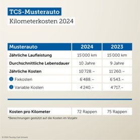Das für die diesjährige Berechnung verwendete TCS-Musterauto basiert auf einem revidierten Neupreis von 41‘000 Franken (Vorjahr 39‘000 Franken). Die durchschnittliche jährliche Laufleistung beträgt 15‘000 Kilometer. Mit den TCS-Berechnungsansätzen ergeben sich bei diesem Musterpersonenwagen feste Kosten von jährlich 6’488 Franken sowie variable Kosten von 4’240 Franken. Insgesamt kostet das Musterauto somit 10’728 Franken pro Jahr, was einem Kilometerpreis von 72 Rappen entspricht. Mit dieser Kalkulation werden die Fahrzeuge nach 10 Jahren und 150‘000 Kilometer abgeschrieben (Vorjahr noch 9 Jahre und 135'000 Kilometer). Die meisten anderen Detailwerte ergaben nur leichte Veränderungen nach oben und unten.