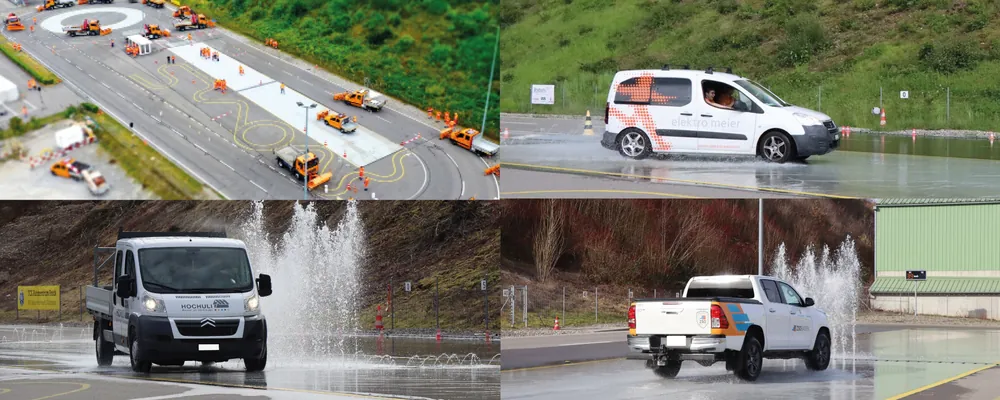 - Simulation von Notsituationen durch Gleitflächen,Wasserhindernisse und Schleuderplatte