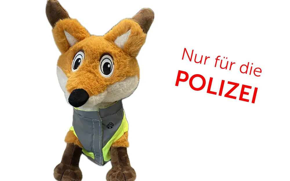 Ausschliesslich für die Polizei. Das Plüschtier Fuchs (35 cm) wird mit einer kleinen reflektierenden Weste geliefert und ist für den Verkehrsbildungsunterricht vorgesehen. Er kann in Verbindung mit dem Bilderbuch oder dem Fussgängerstreifen verwendet werden.