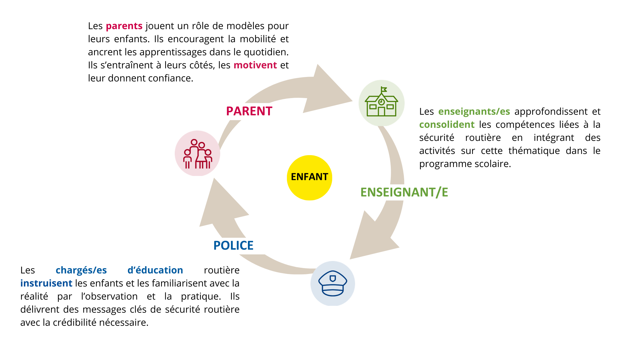 La sécurité des enfants sur la route repose sur un engagement collectif. C’est pourquoi, nos programmes s’appuient sur une approche collaborative, réunissant la police, les parents et le corps enseignant autour d’un même objectif : promouvoir une éducation à la mobilité à la fois cohérente et complète pour assurer la sécurité et développer l’autonomie des enfants. Chacun joue un rôle complémentaire dans l’accompagnement des enfants vers une mobilité plus sûre et responsable. Cette collaboration repose sur des approches pédagogiques différenciées, permettant de coordonner les actions et d’optimiser la transmission des connaissances.