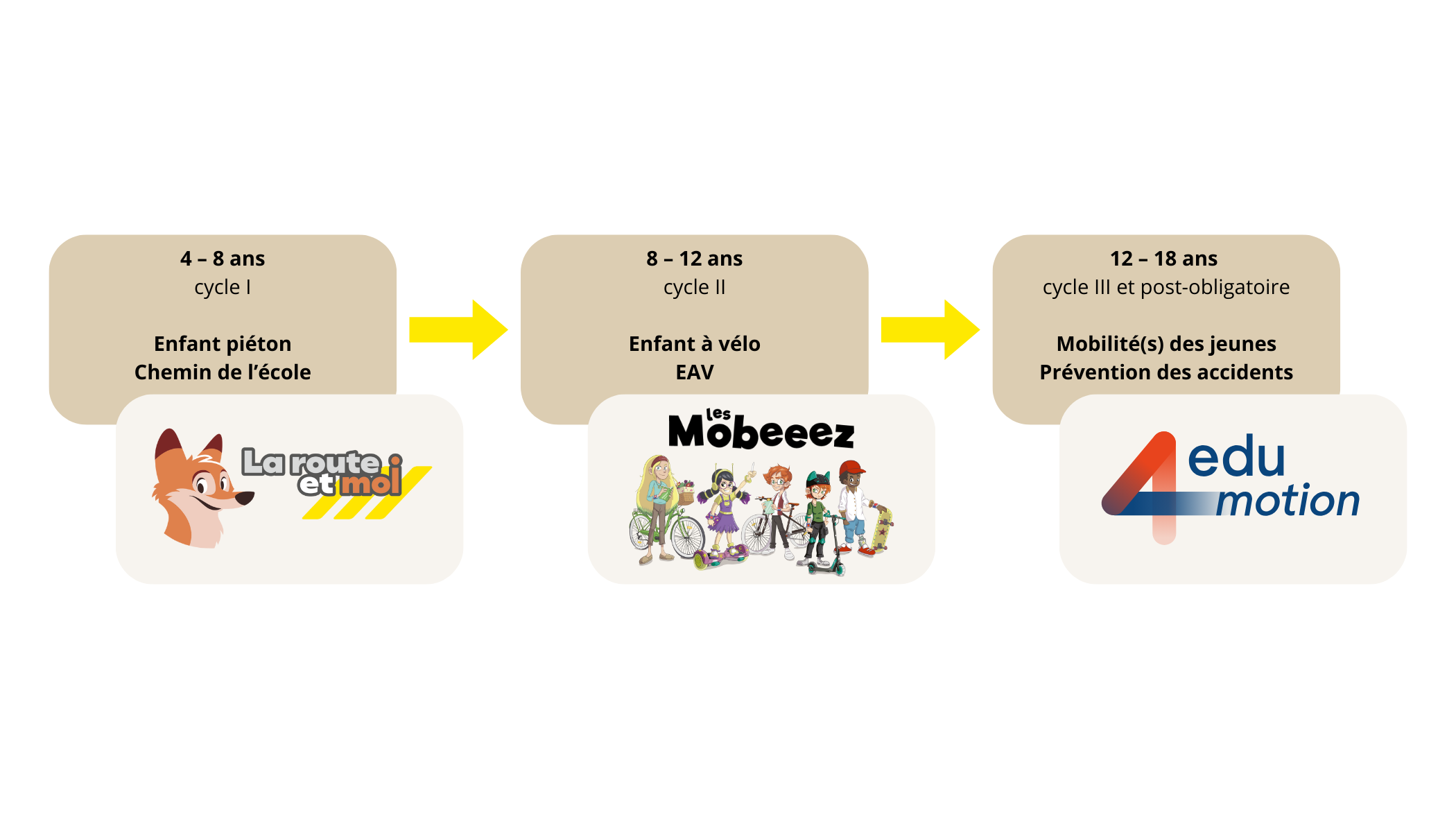 Pour soutenir cet apprentissage, le département Sécurité routière du TCS, en étroite collaboration avec la Haute École pédagogique de Fribourg et la police, a développé le programme d’éducation routière Les Mobeeez destiné aux élèves de 8 à 12 ans. Il propose des outils attractifs, flexibles et innovants, adaptés aux besoins spécifiques des différents acteurs et répondant aux problématiques de la mobilité pour les enfants du cycle 2 (8 à 12 ans). Préparation du vélo, équipement de protection et de visibilité, signalisation, priorités et anticipation des dangers font notamment partie des thématiques abordées par le programme.