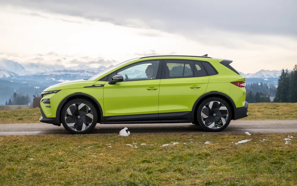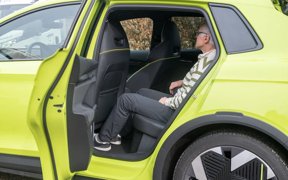 Cela étant, l’Elroq RS offre bel et bien une valeur ajoutée. Ce ne sont pas tant les quelques millimètres de surbaissement qui importent, ni même le surcroît de puissance du moteur. Les versions standard 85 et 85x (4×4) délivrent une puissance maximale de 210 kW, contre 250 pour la RS, soit 340 ch dans l’ancienne monnaie. Le poids du véhicule, environ 2,3 t, garantit toutefois que le chapeau ne s’envole pas immédiatement. Ce qui procure encore plus de plaisir que la performance, c’est l’habitacle aménagé avec goût, avec un plastique agréable au toucher rappelant l’alcantara (suédine), des sièges sport anatomiques et des coutures sur le volant. La planche de bord et les sièges, de teinte vert lime, sont assortis au vert mamba de la carrosserie, ce qui confère une touche de magie à ce SUV familial d’aspect solide.